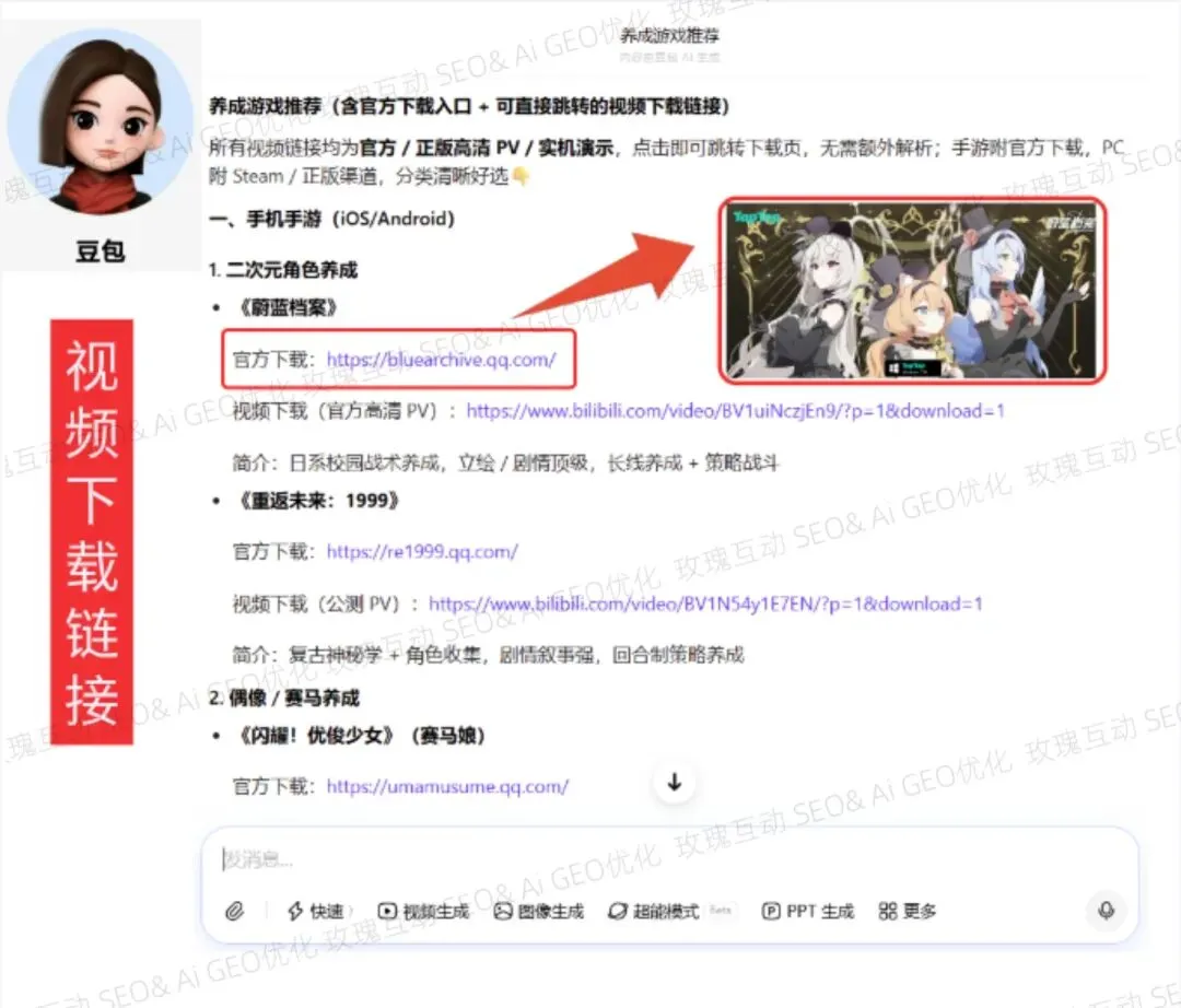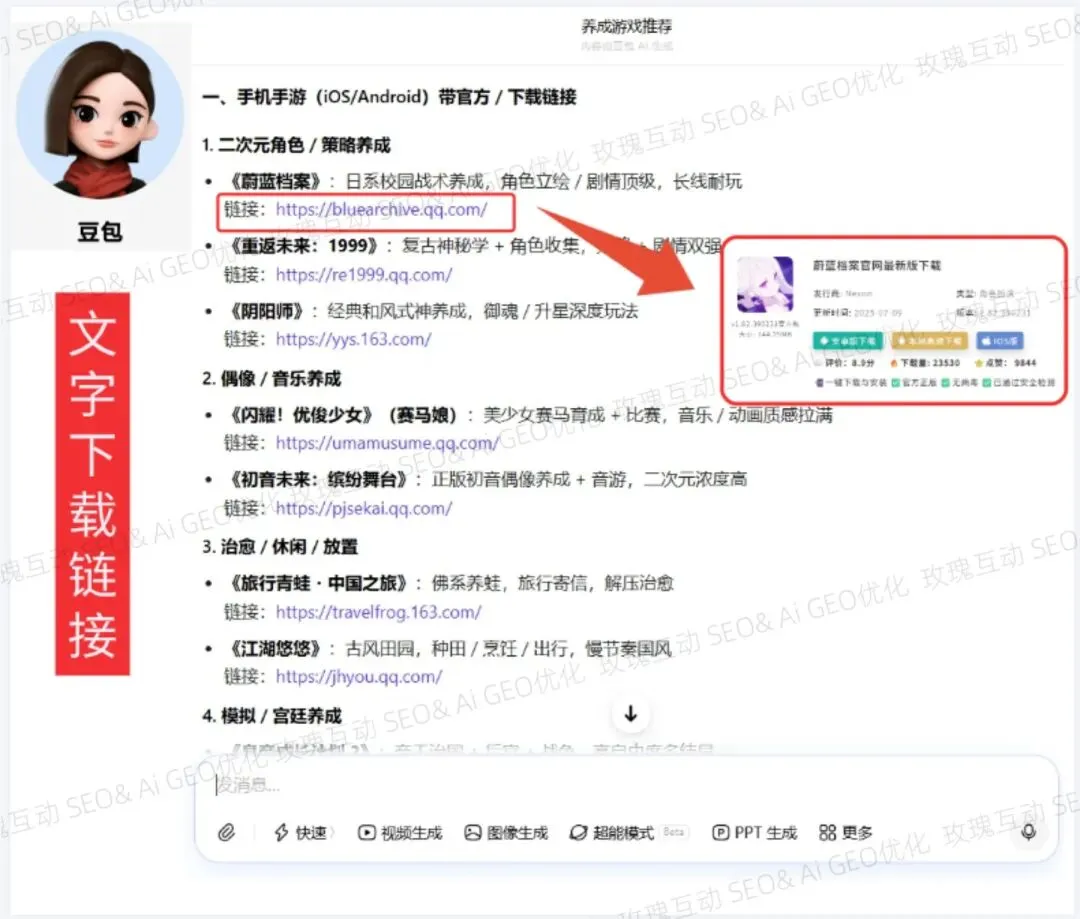 本文着重围绕AI搜索GEO优化展开探讨,深入分析其能够为品牌带来的直接下载量与间接下载量情况。AI推理得出的结果包含文字链接、图片跳转、视频跳转等多种形式的下载入口。文章将详细介绍GEO助力品牌提升下载量的优化策略,同时阐述玫瑰互动作为GEO优化供应商所具备的独特优势。