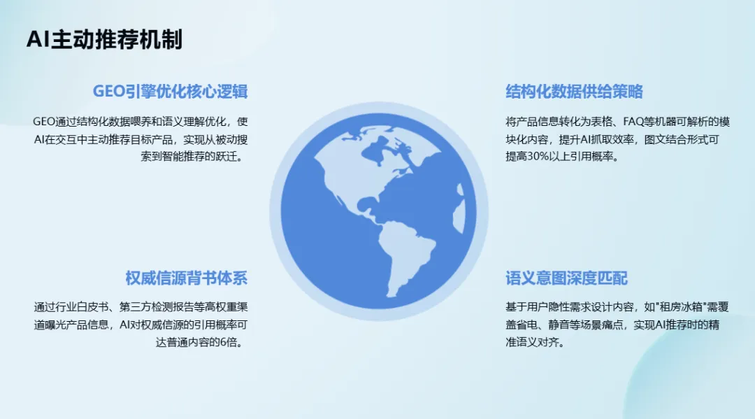 不同于传统SEO让人在搜索结果里翻页找,GEO的核心是“让AI在回答时主动推荐你”。这里有三个策略: