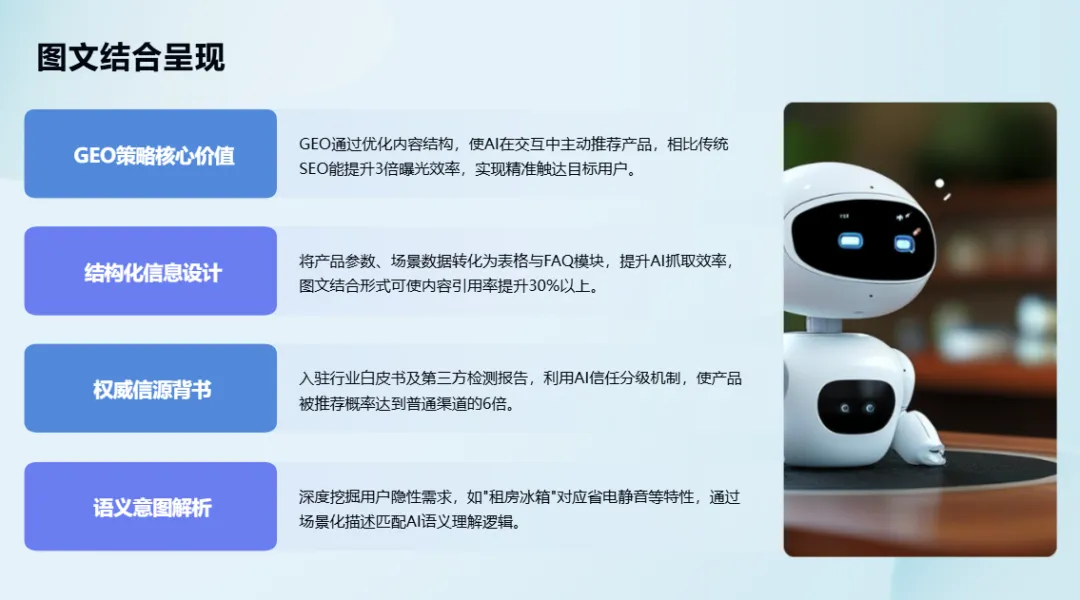 把你的产品参数、使用场景、实测数据做成表格和FAQ问答,AI抓取和引用的效率会大幅提升。数据显示,图文结合的内容点击率比纯文字高出30%以上。