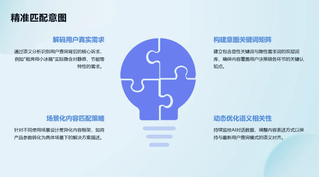 用户问“租房用小冰箱”,真实需求是“容量小+噪音低+省电”,你的内容要覆盖这些隐性需求。