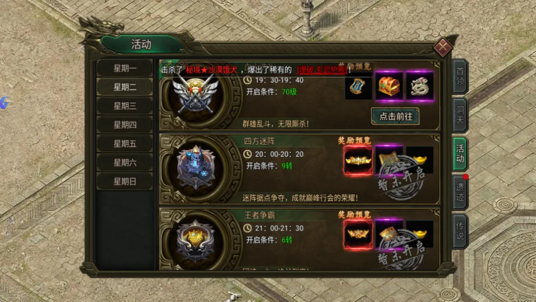 :三大陆隐藏地图、降妖秘境、恶魔广场、血色城堡等,产出转生材料、神装碎片。 - 日常活动