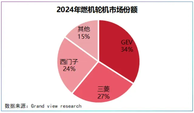 全球市场看,2024年,GEV以34%的市占率居榜首,三菱紧随其后占比27%,西门子则以24%的市占率位列第三,三者市占率合计达85%,呈现寡头垄断格局。