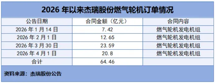 值得注意的是,此份订单是自2026年以来,杰瑞股份拿到的第四份北美燃气轮机发电机组订单,累计订单额达64.46亿元。