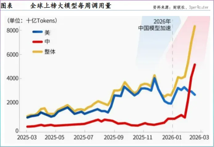 2026年2月,我国AI大模型调用量(消耗的Token总和)仅三周大涨127%,首次超过北美。