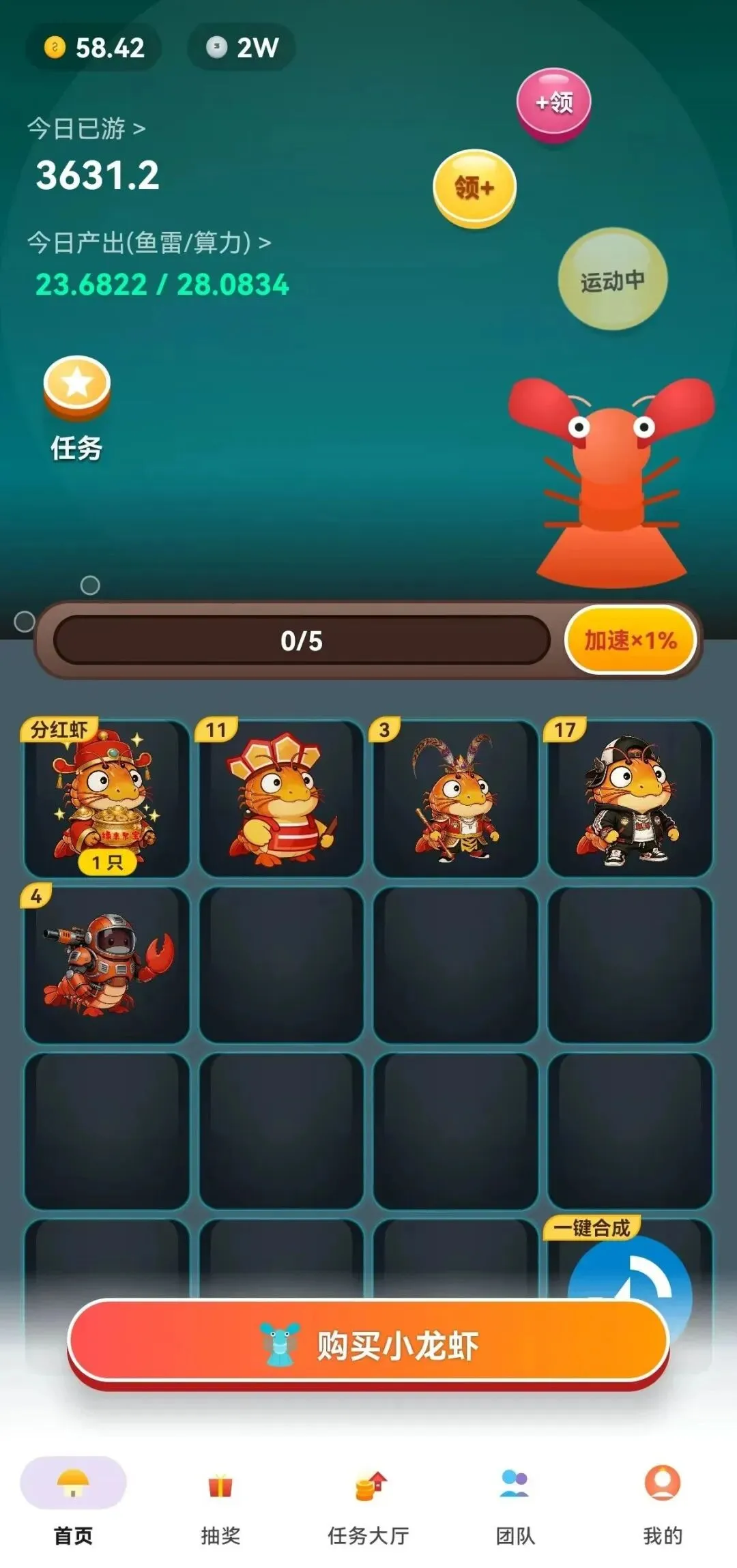 用金币购买 1 级小虾,两只同等级虾一键合成更高等级,最高可升到 38 级!