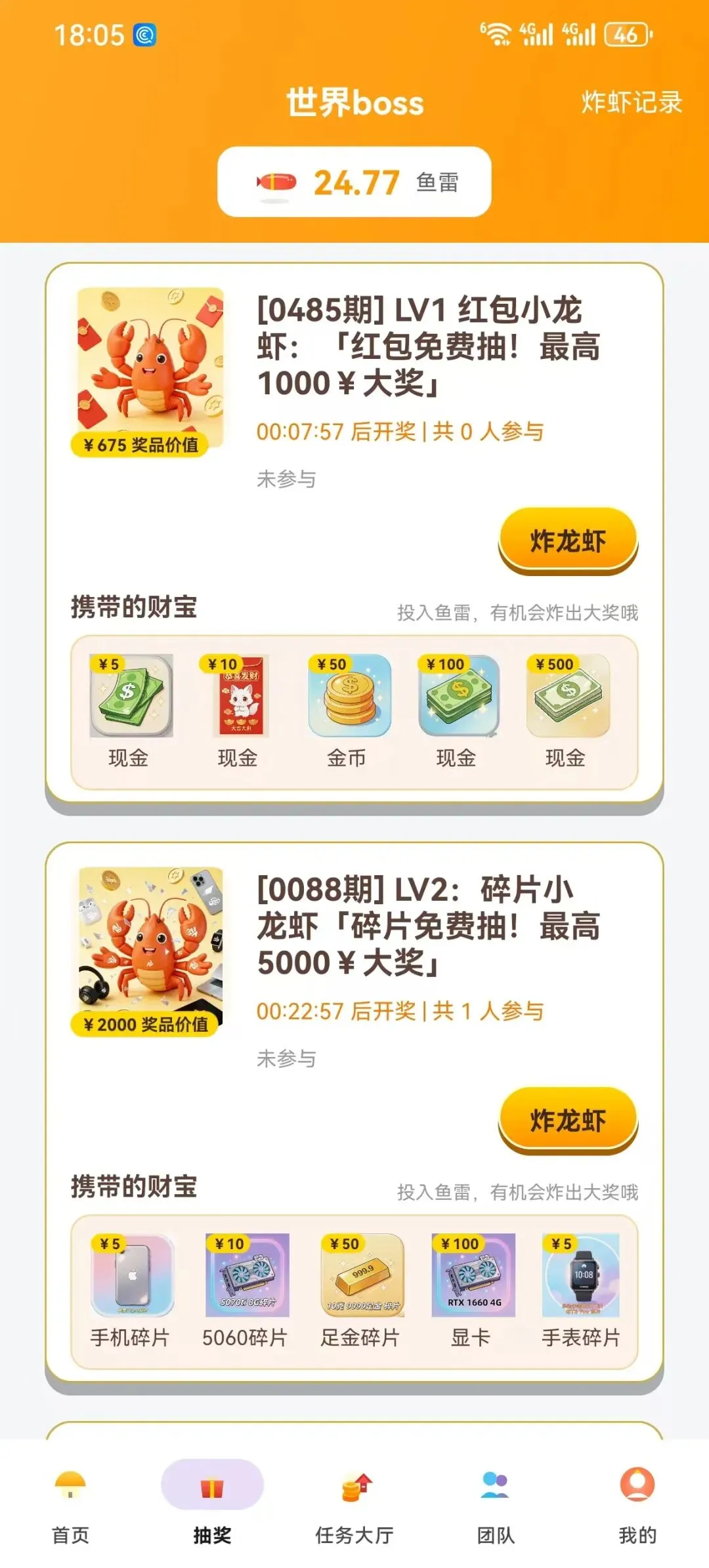 :消耗鱼雷抽奖,随机掉落 5-500 元现金、华为手表、RTX 显卡、高等级虾苗、足金碎片等好礼 -