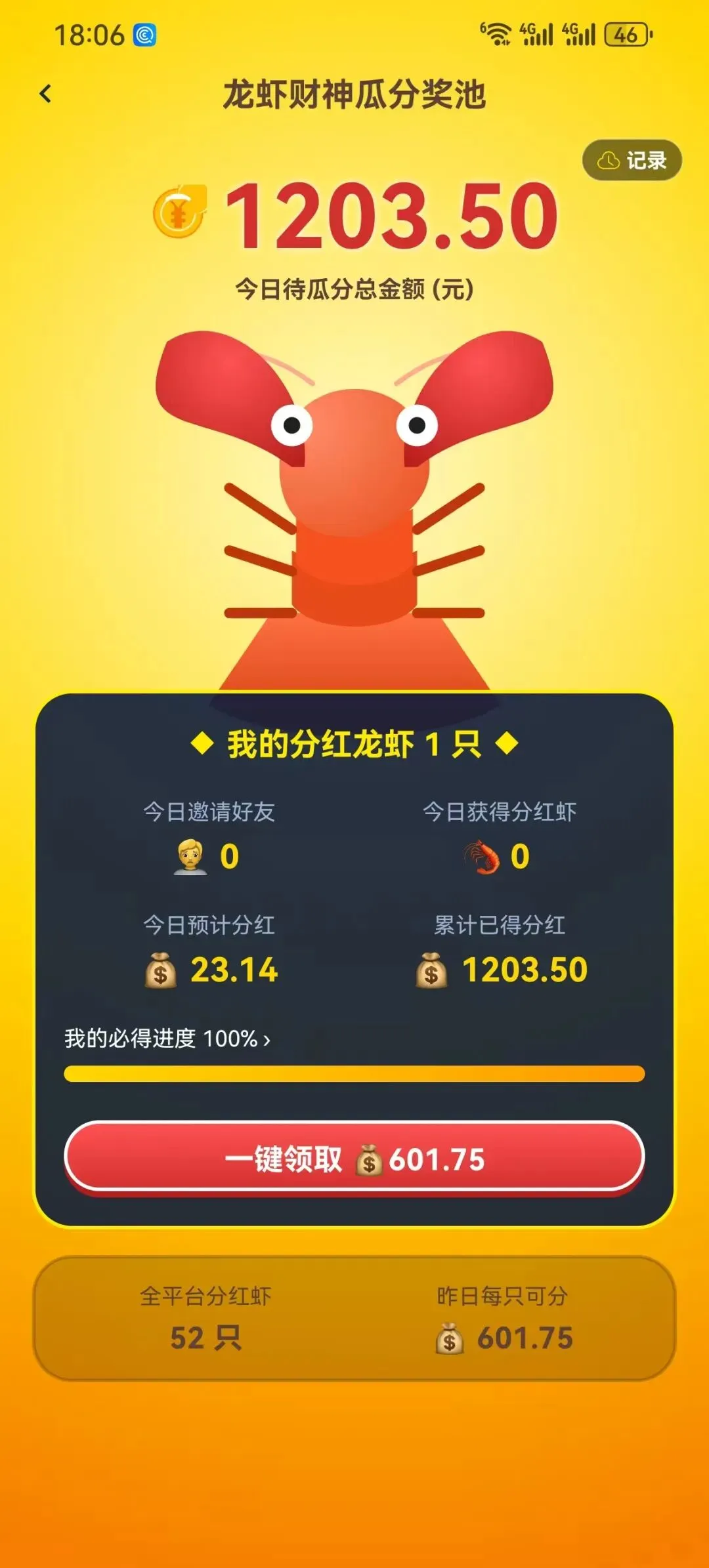 注:分红虾可每日参与平台现金奖池瓜分,全平台限量发放,先到先得