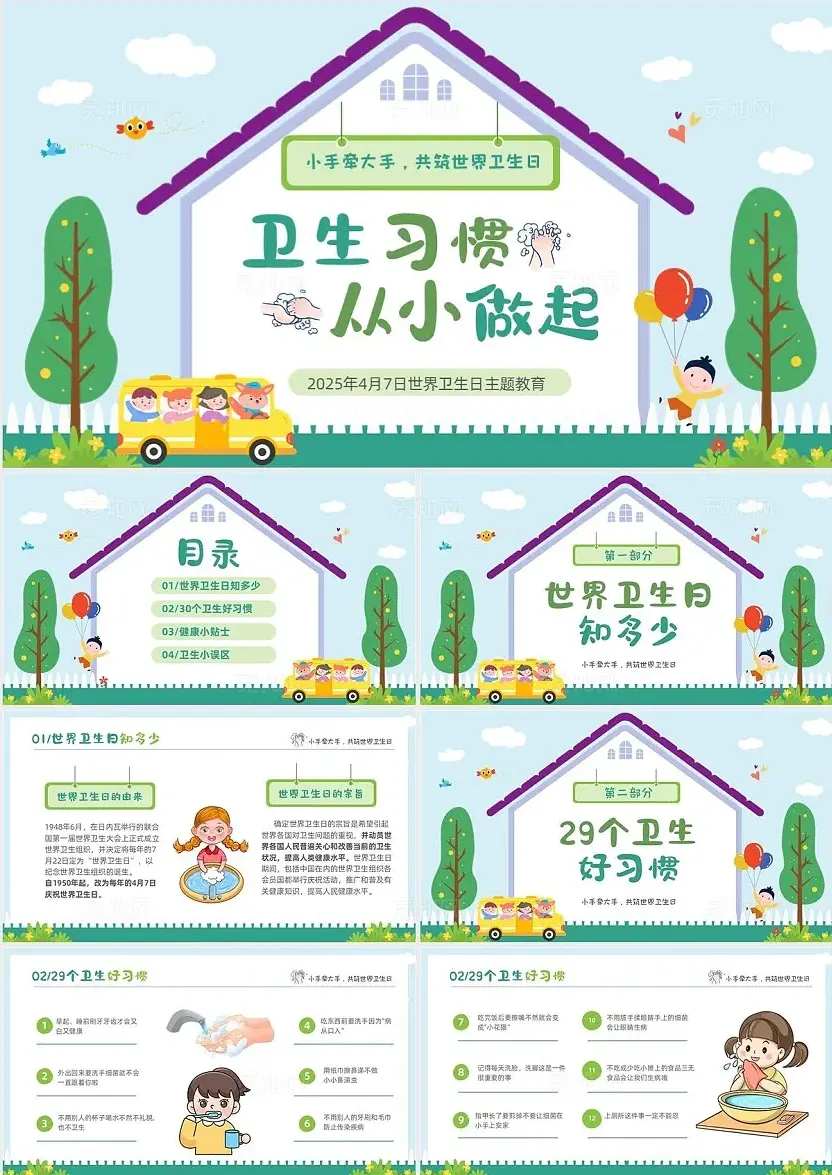 绿色卡通儿童世界卫生日卫生习惯养成主题班会PPT