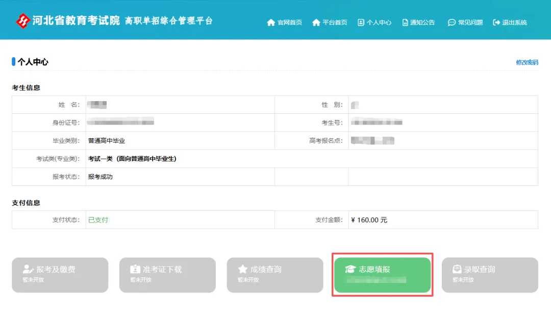 登录成功后系统自动跳转至考生个人中心页面,在志愿填报时间内,考生可点击“志愿填报”按钮进行志愿填报,如图2所示。
