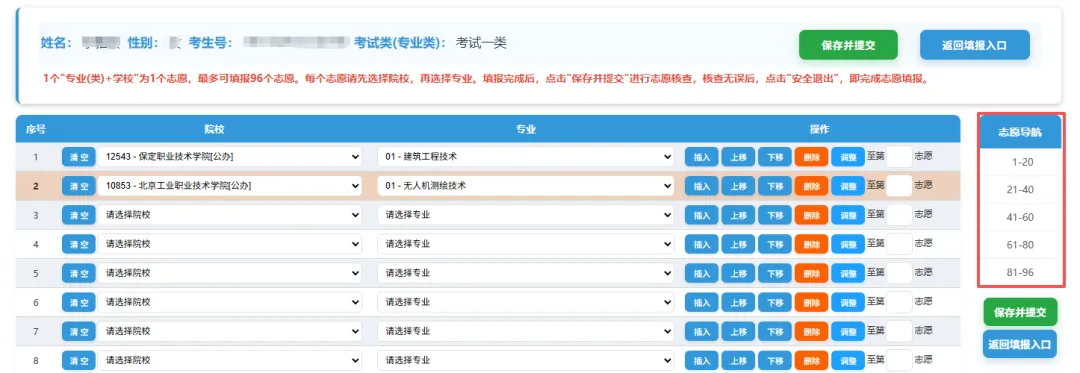 注意:保存志愿时,所填志愿序号必须连续,中间不能留空,否则系统无法保存。例如未填序号1(第一行)的院校及专业,而跳过去直接填了序号2(第二行)的院校及专业,志愿填报系统不予支持。