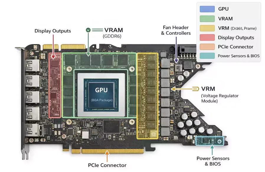 GB300 功率密度极高(NVL72 机架可达 MW 级),如果只测芯片热,实际部署时 VRM 过热会导致系统降频甚至损坏。TTV 必须模拟完整热 profile,否则冷却方案“纸上谈兵”。下面这张典型高功率 AI 加速卡 PCB 布局图,清晰标出 GPU、VRM(电压调节模块)和周边电源元件的位置: