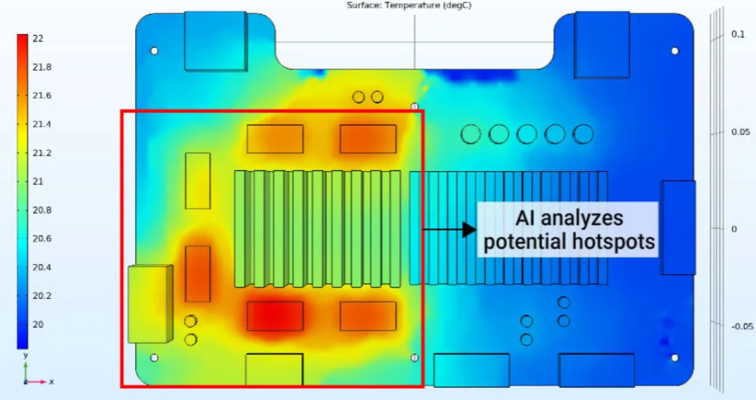 这些热量形成多个局部热点,直接影响冷板接触面、气流/液流路径和整体温度梯度。真实 VRM 热点热图(AI 板卡仿真):