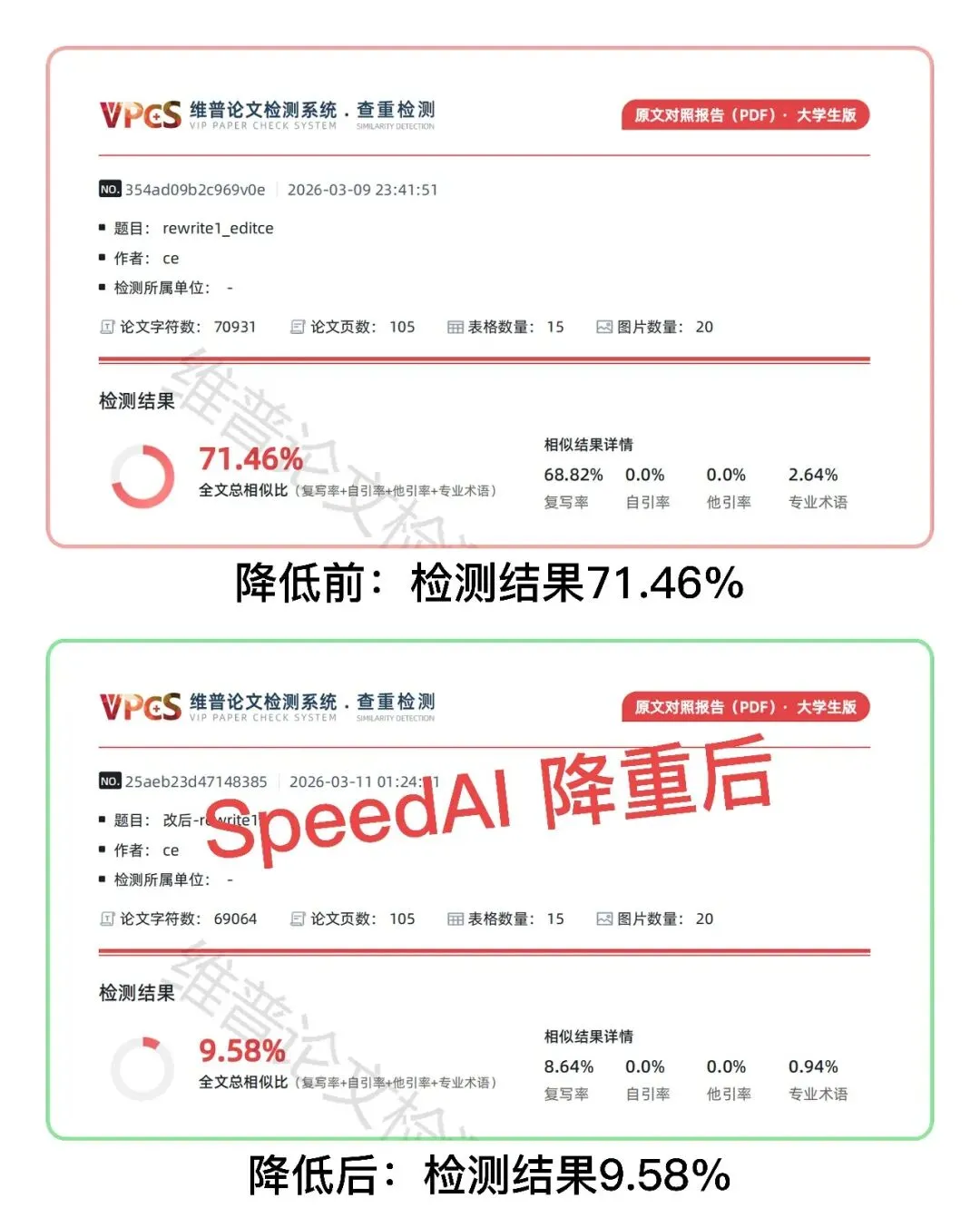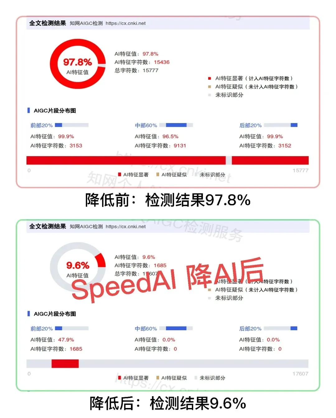 3. 「SpeedAI降AI效果图」:对比降AI前后的检测结果,高风险段落精准改写,AI生成率可降至个位数安全区间