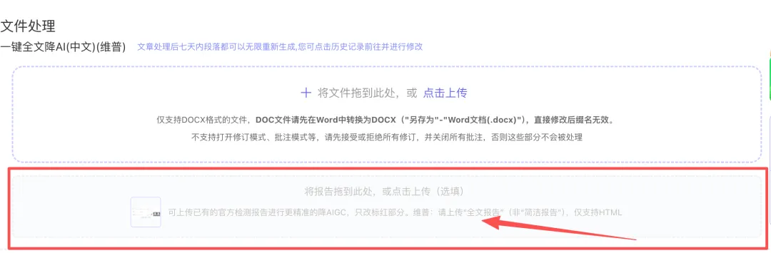 * 核心优势:独创“逻辑解构+语义重塑”技术,不破坏原文核心论证逻辑,同时精准替换AI生成痕迹词汇;针对不同专业(医学、工程、人文等)内置专属学科术语库与表达规范,改写后内容专业度不减、表述更精准;支持100%保留论文原格式(标题、字体、公式、表格、参考文献),无需二次排版;上传官方检测报告后可实现“靶向修改”,只优化高风险标红段落,合格内容完全不动;还可一键上传Word全文处理,智能区分待修改内容与需保留的参考文献、专有名词,处理后直接导出可用文件。