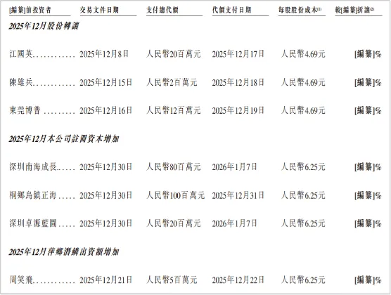 在12月8日、12月15日,江国英、陈雄并等个人投资者、机构投资者东莞博普的投资价格为4.69元/股。仅仅半个月时间,成本就飙升了33.26%至6.25元/股。而更早的9月份,个人投资者谭翠辉、王钰、陈佳婷等人的成本仅3.75元/股。