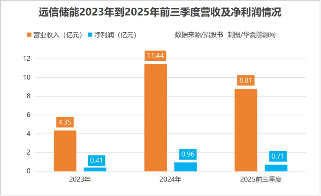 2023年至2025年前三季度,远信储能的营收分别为4.35亿元、11.44亿元、8.81亿元,净利润分别为4074.1万、9626.5万和7089.2万元。