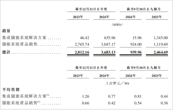 远信储能大部分收入来自单一大型项目中部署集成储能系统解决方案。从2023年到2025年前三季度,其解决方案销量从46MWh增长至1.35GWh,系统产品则由2.76GWh跌至1.12GWh。