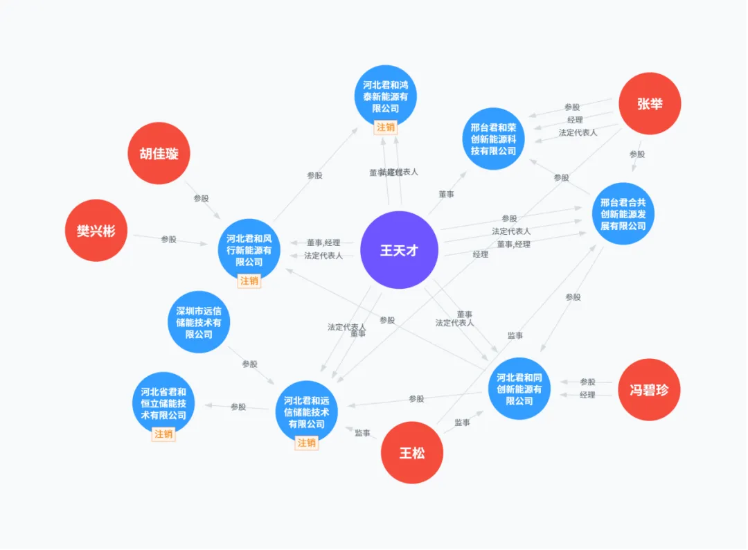 例如吉林君和在2025年4月变更了法人,变更前是“王天才”,王天才同时也是河北君和的法人,也就是远信储能2024年的第四大客户。此外,而王天才担任法人、在2024年成立了三家“河北君和”开头的公司,在2025年均陆续注销,其中就包括远信储能曾持股的河北远信。