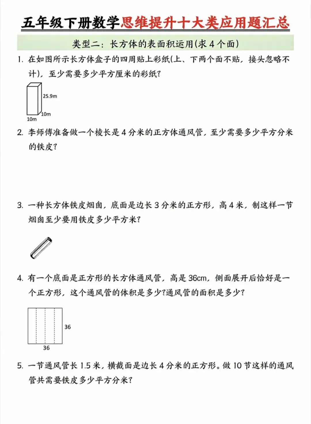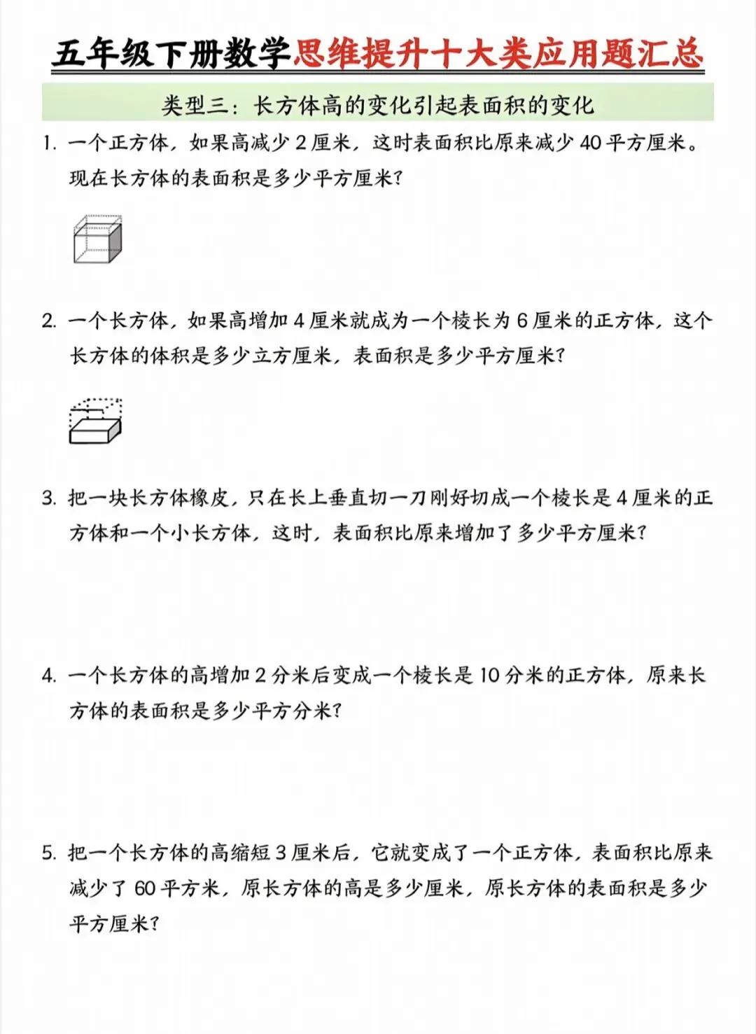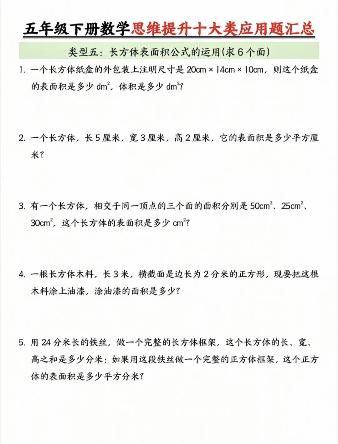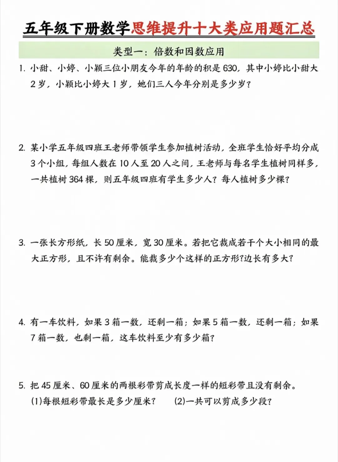 五年级下数学思维提升十大类应用题汇总|可打印 以下为部分截图,具体看完整PDF文件 (温馨提示:文末有电子版领取方式) 领取完整电子版: ①:点点右下角的“赞”和“在看” ②:关注公众号点击资料领取按钮