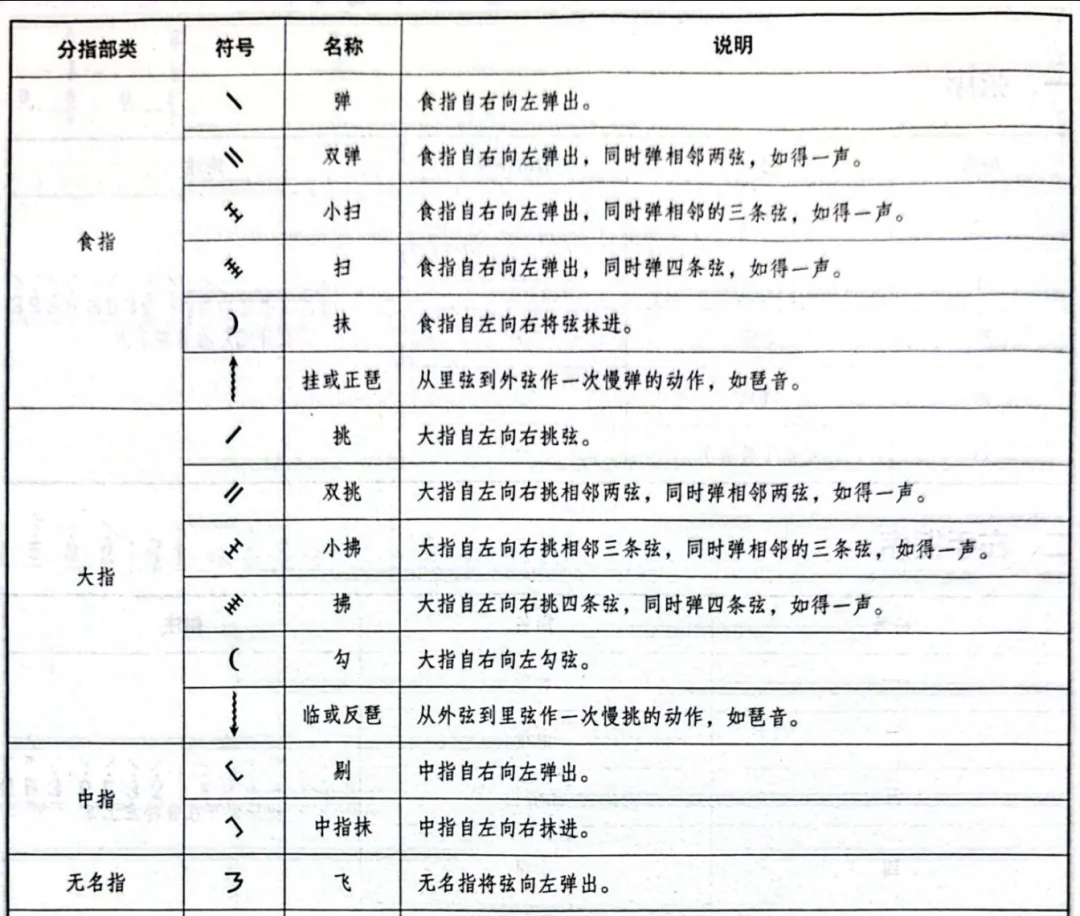 j.临:用右手拇指自子弦而中弦、老弦、缠弦向右次第挑进。