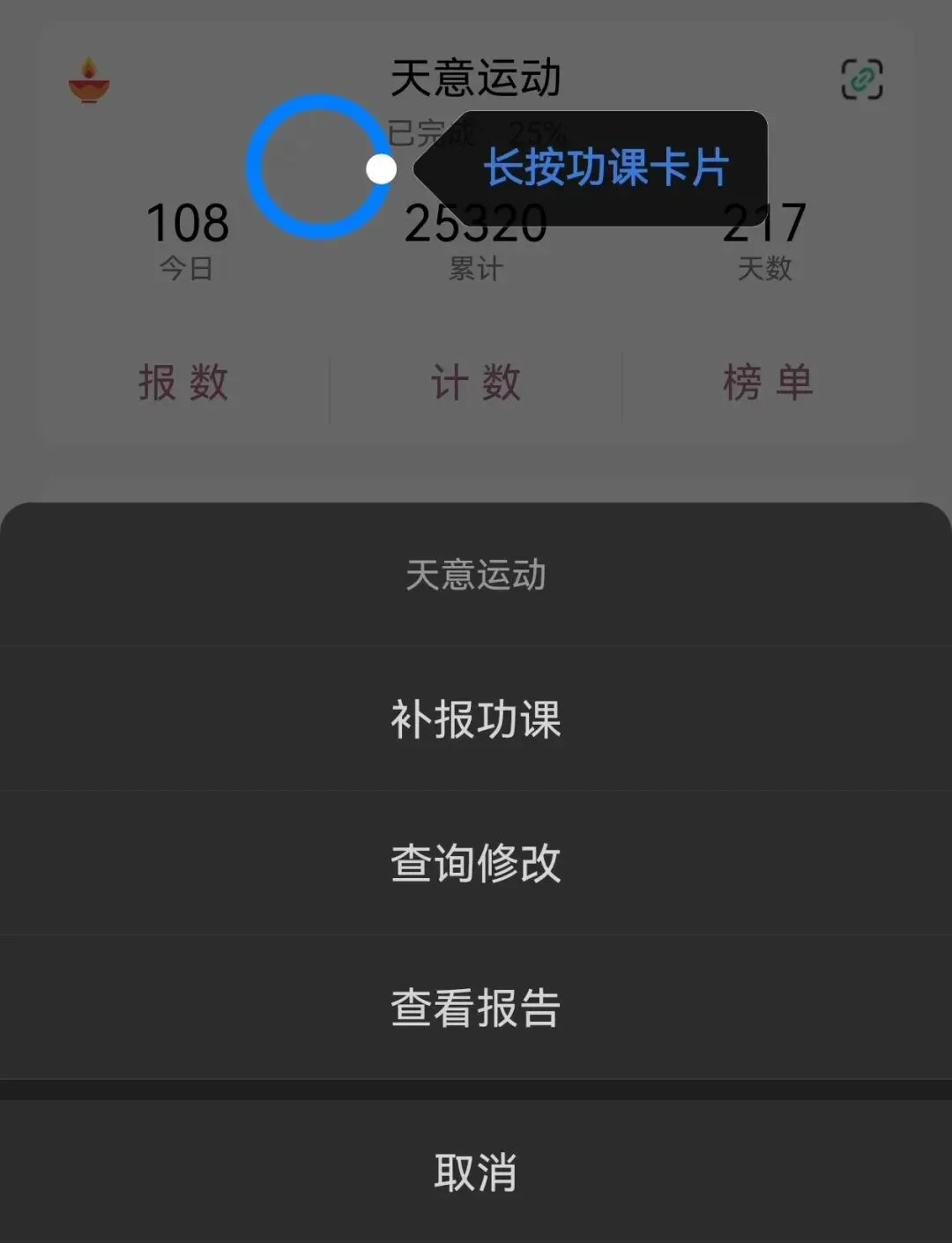 在主页面,长按功课数据卡片,就会弹出快捷操作菜单,目前支持补报、查询、修改和查看报告。