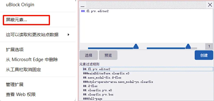 这是一个和Adguard差不多的广告屏蔽插件,它也可以屏蔽视频广告,除此之外,这个插件最大的亮点是可以自己选取屏蔽元素,通过这个屏蔽元素,你可以用鼠标自己选择屏蔽的对象,然后创建屏蔽规则。插件地址: