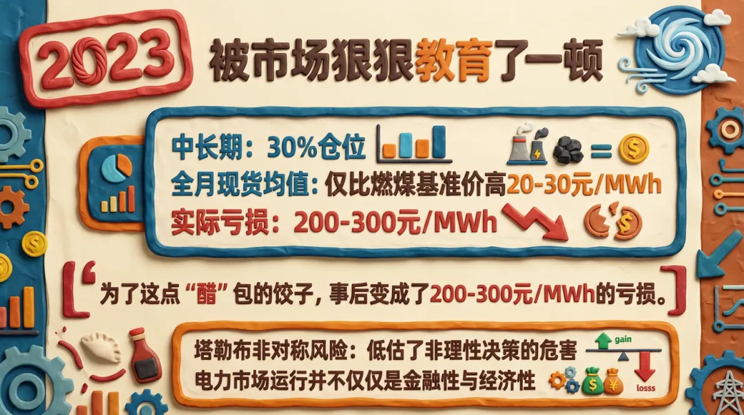 直到现在,每每复盘的时候才后知后觉,自己以前在金融市场学到的风险理论,塔勒布的非对称风险在真金白银的收益面前,还是低估了非理性决策的危险程度。当时全月的现货均值也就比燃煤基准价高20-30元/MWh,为了这点”醋”去包的饺子,事后却变成了200-300元/MWh的亏损,因为现货的下限能到0至-80元/MWh。为了这比基准价高2-3分的收益,真是有点得不偿失了。