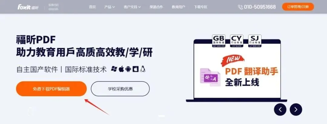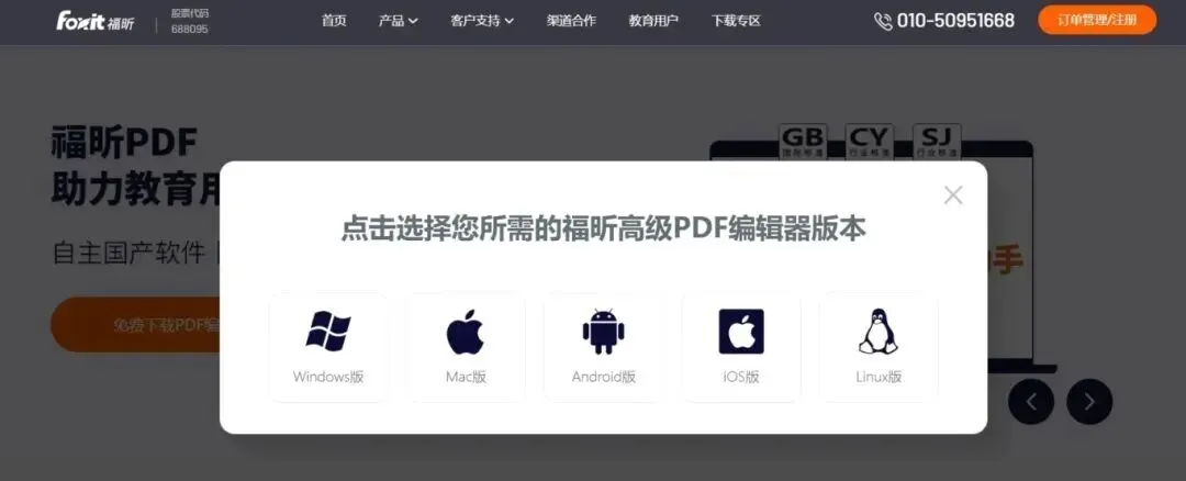 找到下图轮播图,点击“免费下载PDF编辑器”,选择所需版本进行下载(含Windows、Mac、iOS、Android、Linux版本)