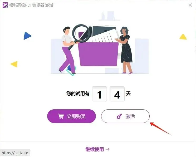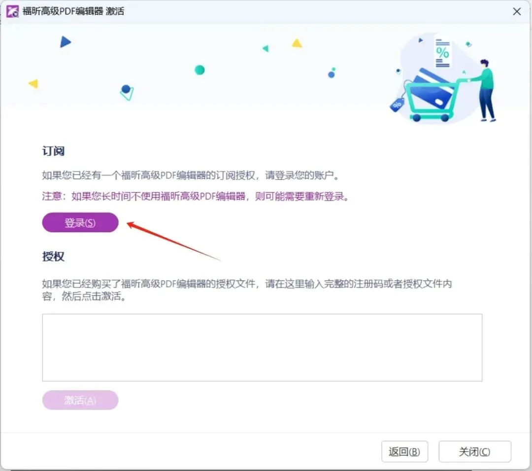1.根据指引安装福昕高级PDF编辑器,跳出激活对话框后,点击“激活”>“登录”。