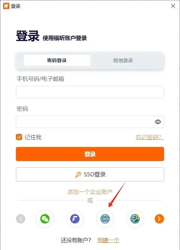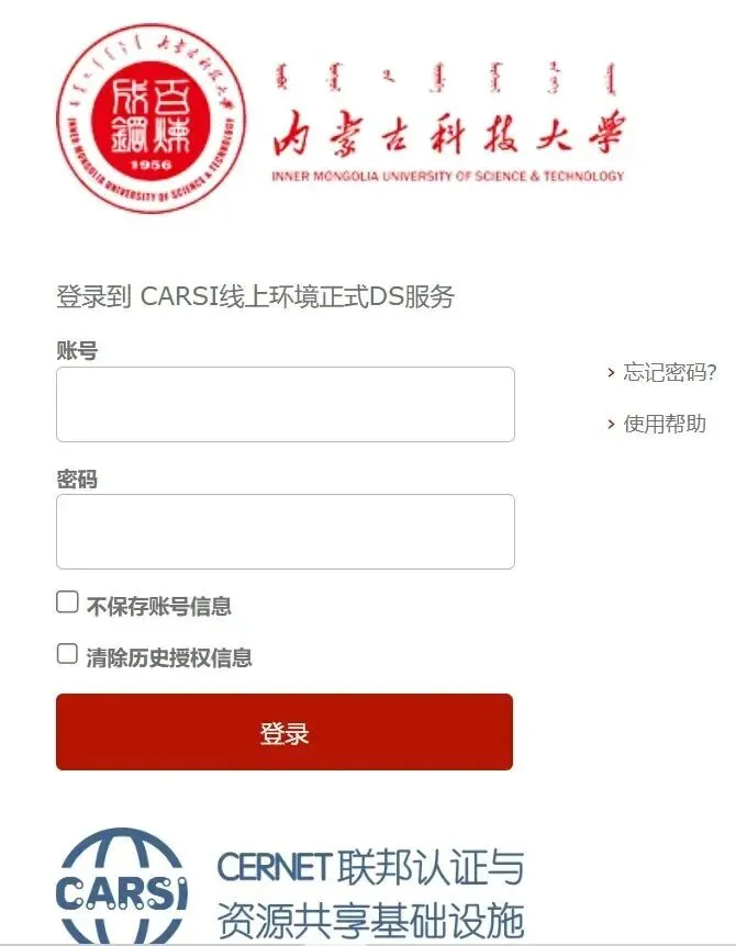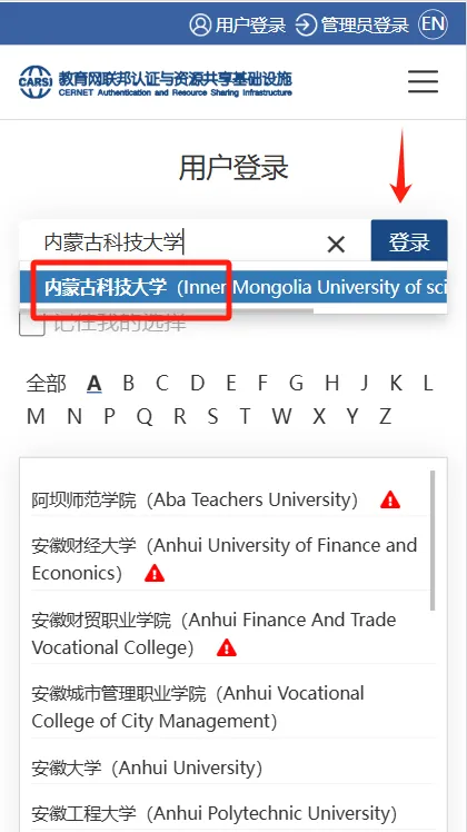 2.在登录界面中,选择底部的CARSI按钮在跳出的网页中填入学校名称,选择学校,点击“登录”按钮。