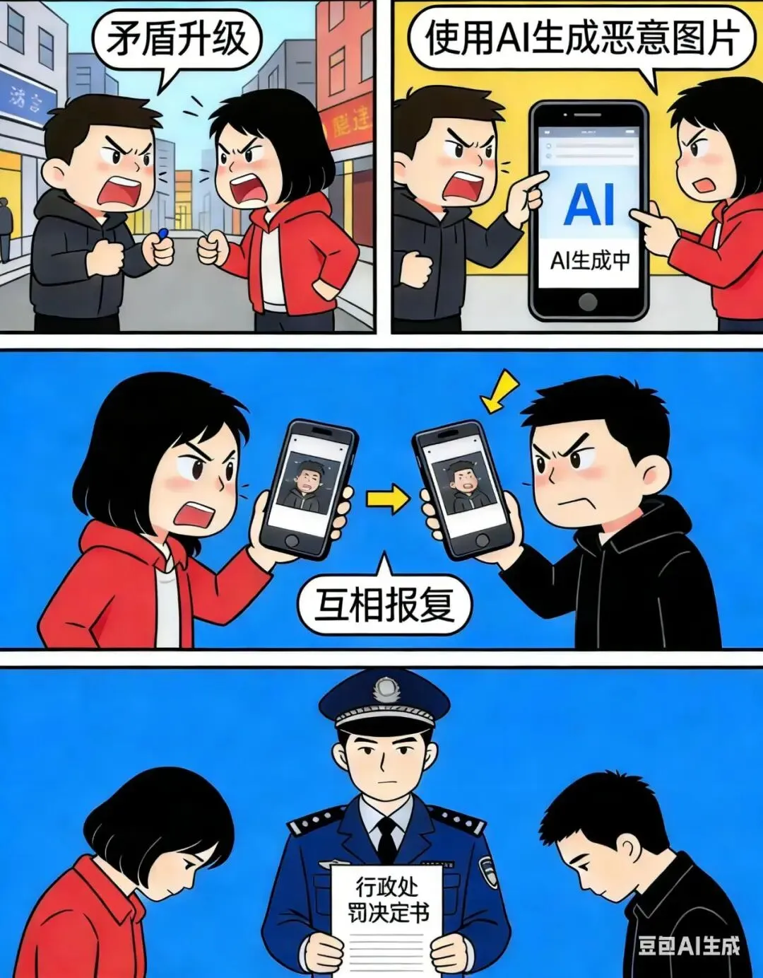 网络空间不是法外之地,AI技术更不是违法犯罪的“挡箭牌”。利用AI深度合成技术制作、传播侮辱、诽谤他人、侵害他人人格权益的违法信息,违反《中华人民共和国治安管理处罚法》《中华人民共和国民法典》《互联网信息服务深度合成管理规定》等法律法规;情节严重构成犯罪的,将依法追究刑事责任。本案中,双方当事人本可通过协商、投诉、诉讼等合法途径化解纠纷,却选择“以暴制暴”、滥用AI技术实施网络报复,最终双双受到法律制裁,教训十分深刻。