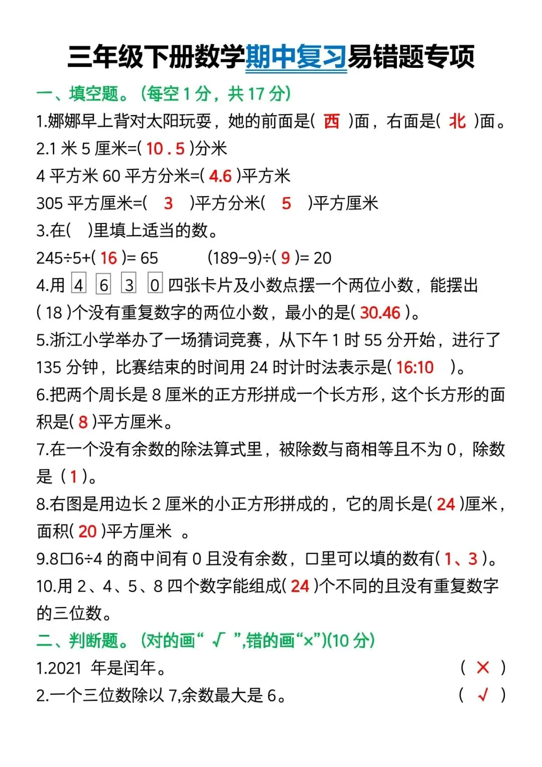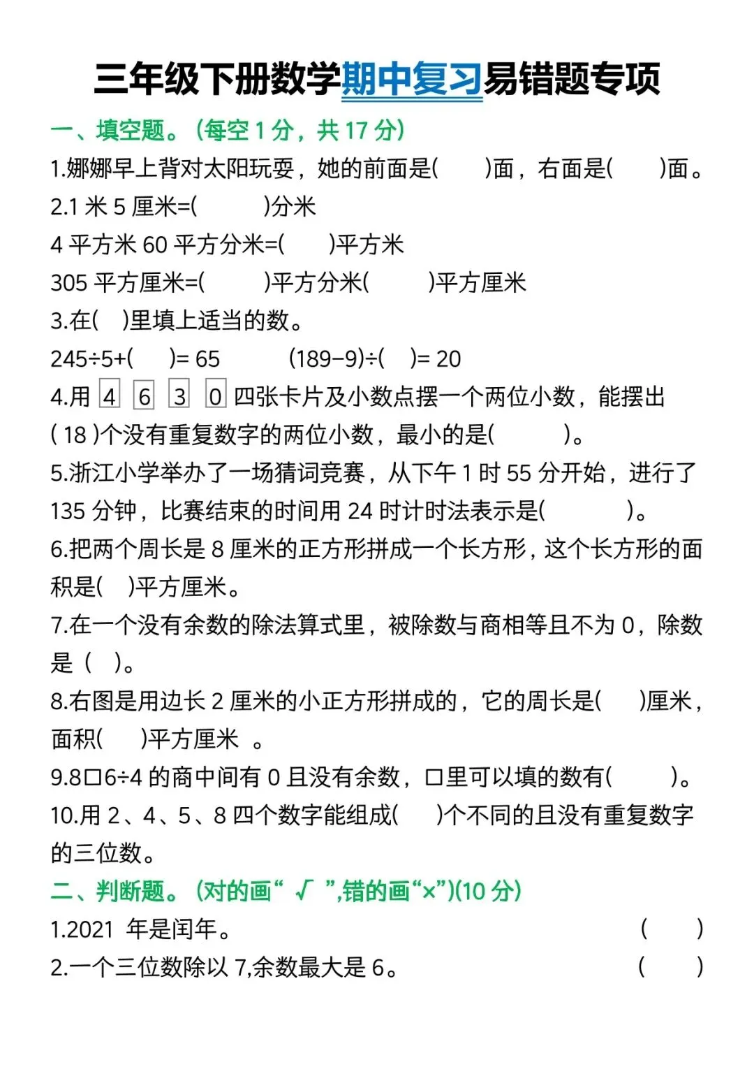 可下载丨26春三年级下册数学期中复习易错题,电子版可打印