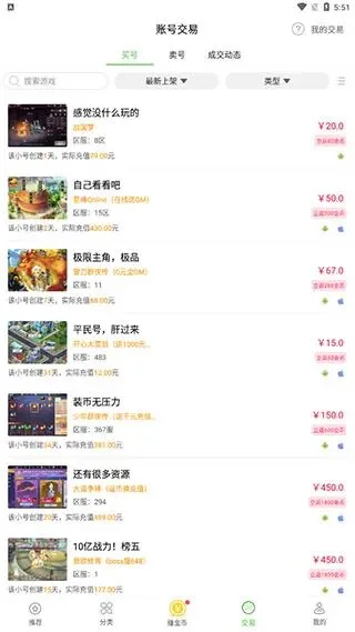4、点击第三个模块,切换为交易区域,在这里你可以出售游戏账号或购买游戏账号。