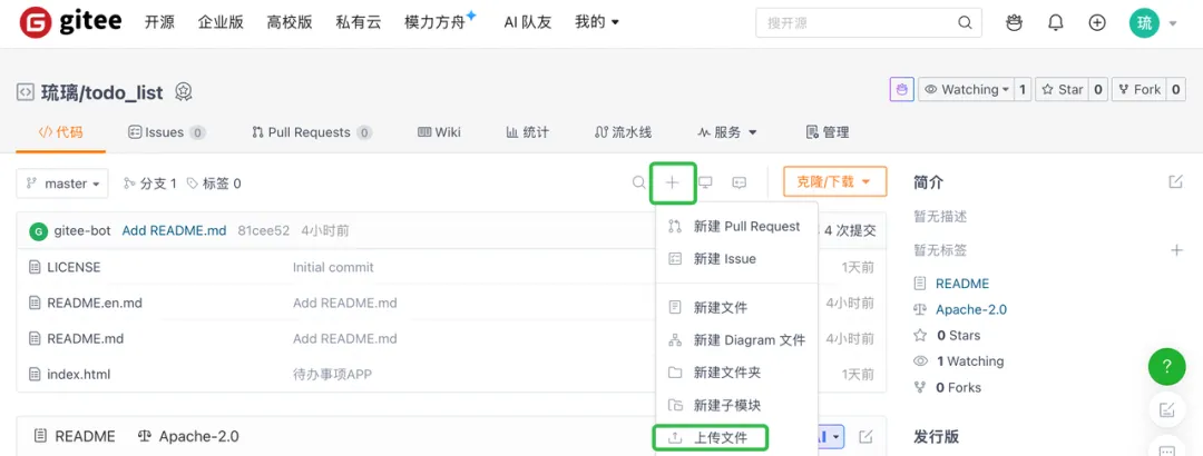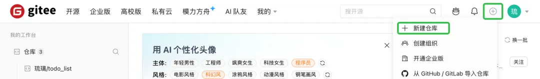 登录后新建一个代码仓,把利用 Trae 开发的代码放上去,记得设置成开源。