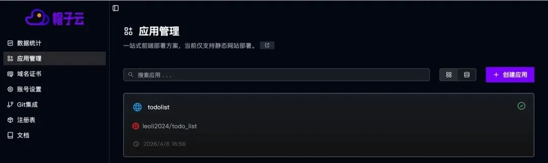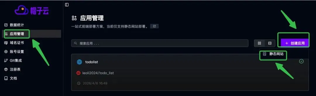 注册完成后,登录进去,点击右侧的应用管理,然后创建应用 -> 静态网站。