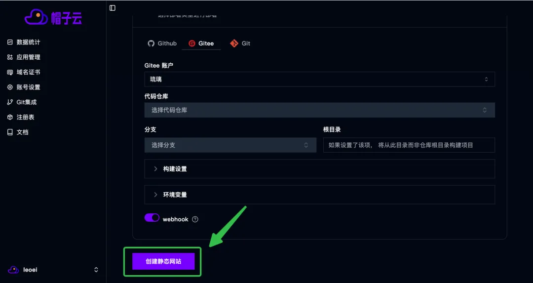 选择 Gitee 去授权,然后创建静态网站。