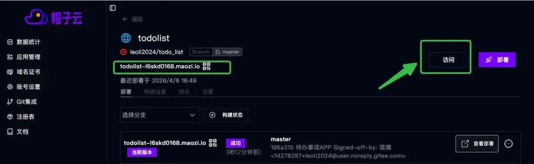点一下“部署”,代码就发布到线上了,下面框出来的就是访问地址。