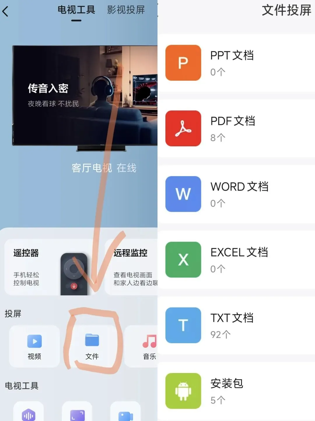 3. 电视打开 我的应用 → HI投屏 → 文件投屏
