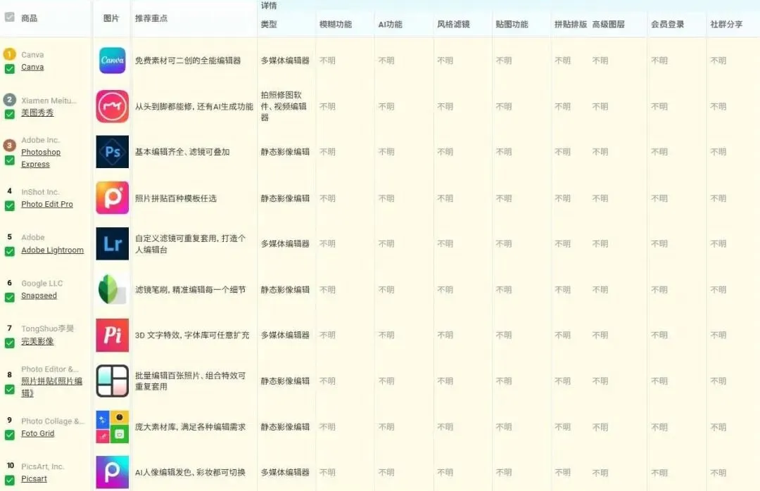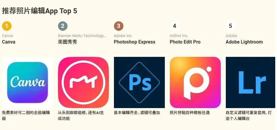 此次,我将会以排行榜的方式推荐可对应iPhone iOS及Android系统的照片编辑App,例如Canva、美图秀秀、Photoshop Express、Photo Edit Pro、Snapseed、完美影像等,快来一起动动手指、将喜欢的照片加以美化,使其闪闪动人吧!