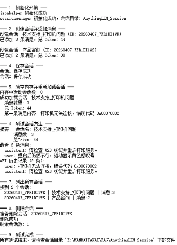 {"SessionId": "20260407_7FR1DI1WR","threadSlug": "thread_001","workspaceSlug": "tech_support","Name": "技术支持_打印机问题","createdAt": "2026.04.07 23:05:43","updatedAt": "2026.04.07 23:05:43","totalTokens": 44,"messageCount": 3,"Messages": [{"role": "user","content": "打印机无法连接,错误代码 0x80070002","timestamp": "2026.04.07 23:05:43","tokensUsed": 12},{"role": "assistant","content": "请检查 USB 线缆并重启打印服务。","timestamp": "2026.04.07 23:05:43","tokensUsed": 18},{"role": "user","content": "重启后仍然不行,驱动显示黄色感叹号","timestamp": "2026.04.07 23:05:43","tokensUsed": 14}]}