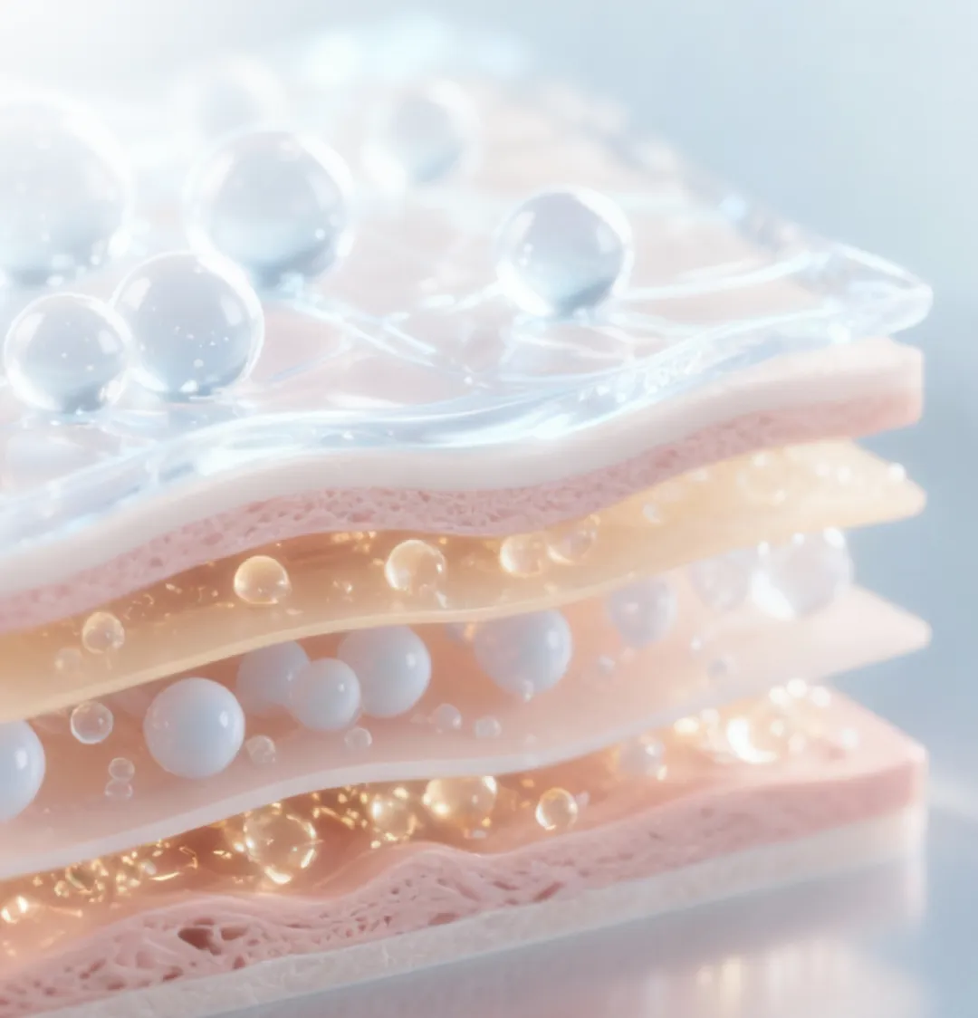 这一层专注于多维锁水保湿、修护干燥。4D玻尿酸的四种分子分层渗透,实现内补外锁;多氨基酸多糖缩合物仿生保湿,增强肌肤弹性与润泽感,两者结合,让肌肤长效水润饱满,改善干燥粗糙。