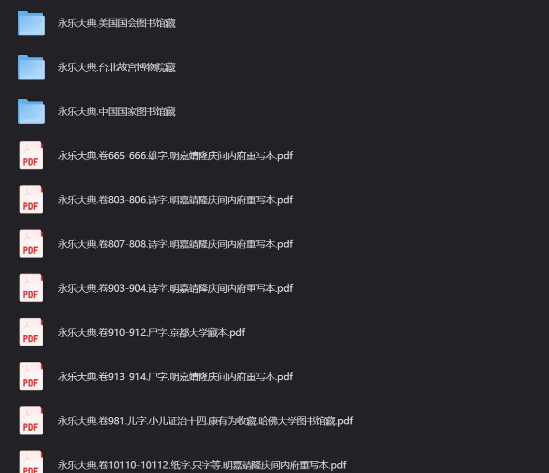 《永乐大典》是明成祖朱棣命解缙、姚广孝等人主持编纂的一部规模空前、内容浩瀚的类书,成书于永乐六年(1408年)。全书辑录了上自先秦,下迄明初的七八千种古籍,按韵目编排,规模达11,095册,约3.7亿字,被誉为中国古代最大的百科全书。其内容包罗万象,涵盖经、史、子、集、天文、地志、阴阳、医卜、僧道、技艺等,具有极高的文献与史料价值。正本下落成谜,副本在明清战乱及近代屡遭劫难,绝大部分毁失,现全球仅存400余册、800余卷及部分零页,散藏于多个国家与机构,被称为“散本”或“残本”。所谓“全散本”PDF,即指对现存所有已发现、已公开的《永乐大典》散册、残卷的数字化汇编。此资源是研究中国古代文化、历史、科技、文献学的无价瑰宝,其每一页的发现都可能保存着已佚古籍的珍贵信息。