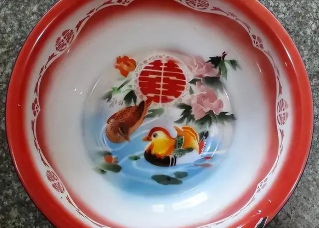 结婚用的搪瓷盆,一盆双喜,里头画着鸳鸯莲花,红色包边一圈,搪瓷砸一下掉漆但不烂,家里洗脸、剁饺子馅都离不开,有人还放在门口种绿萝,虽然塑料盆便宜,搪瓷盆还真舍不得丢。