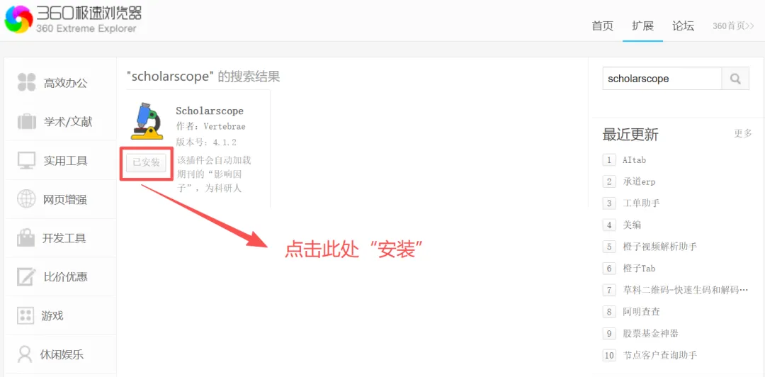 转跳网页链接,进入360浏览器扩展中心,点击安装: