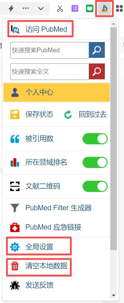 2、在浏览器右上角工具栏找到Scholarscope图标,左击图标,在下拉菜单中点击「清空本地数据」以确保插件正常运行;