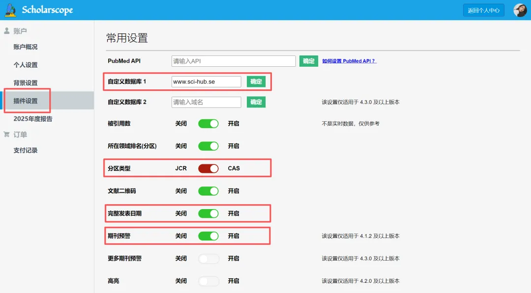 左击Scholarscope图标,选择「全局设置」进入常用设置页面,选择「插件设置」标签,自定义开启被引用数、所在领域排名(分区)、分区类型、完整发表日期、期刊预警等设置。