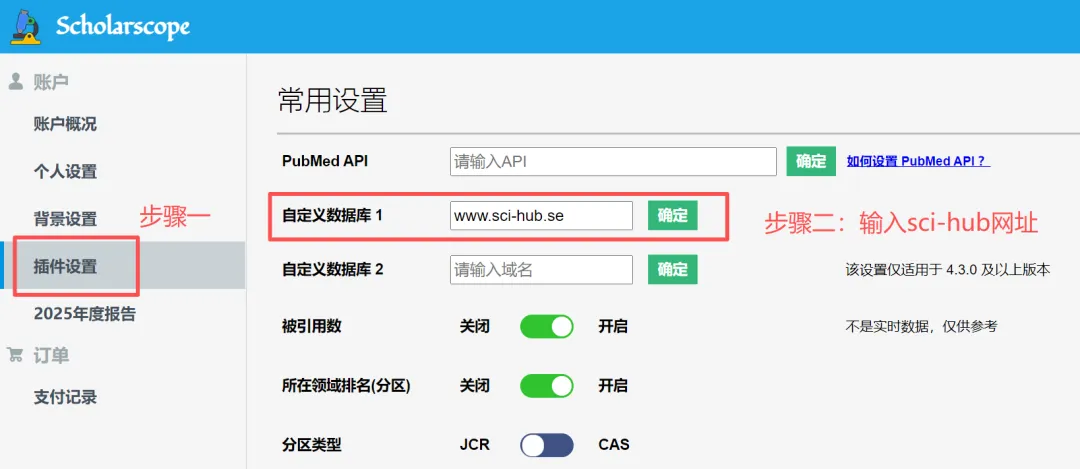 ⚠️ 5、重要提示:在“自定义数据库”中添加Sci-Hub链接,配置全文下载地址