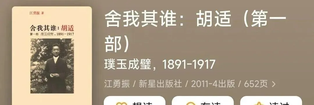 《舍我其谁:胡适》是学者江勇振耗费十余年完成的多卷本胡适传记,依托海量一手档案、日记与书信,完整还原胡适从少年求学、留学美国,到领导新文化运动、参与时代思潮、历经政治风云直至晚年的一生。作品以严谨考据梳理其思想脉络与人生轨迹,跳出神化叙事,客观呈现其在学术、文化、政治领域的抉择与影响,是兼具史料价值与深度的胡适研究重要著作。
