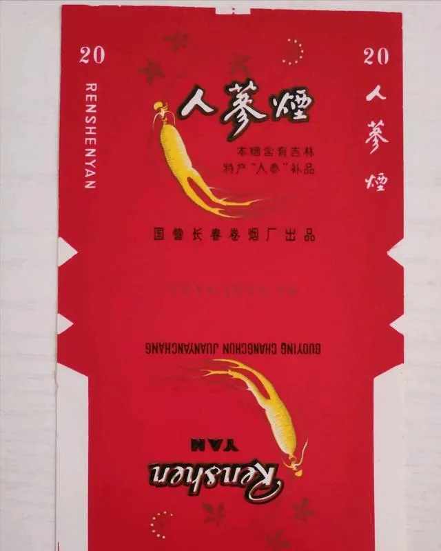 红皮金字,一根人参画得活灵活现,这个叫人参烟,吉林出品,主打的就是补,抽着还真有点人参香味那意思,爷爷以前干林业,工地上就爱点这个烟,口感淡,抽着不辣嗓子,爷爷还常念叨“抽人参烟,补补身子”,一个老味道,憨厚中有点俏皮,现在要是真想找,估摸着要从老烟民手里蹭一支来回味一下了。
