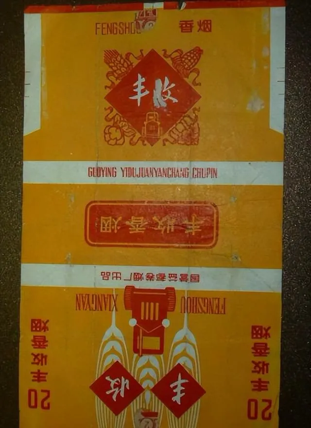 橙黄为底,大红“丰收”字样铺中间,这个叫丰收香烟,山东益都出品,七八十年代一度被叫作“干部烟”,开始的时候只听见有人吃,见不着有人买,设计风格里透着点丰衣足食的盼头,现在抽烟的年轻人还真不认这老家伙,小时候大人嘴里老叨叨,有钱了才舍得抽丰收烟。